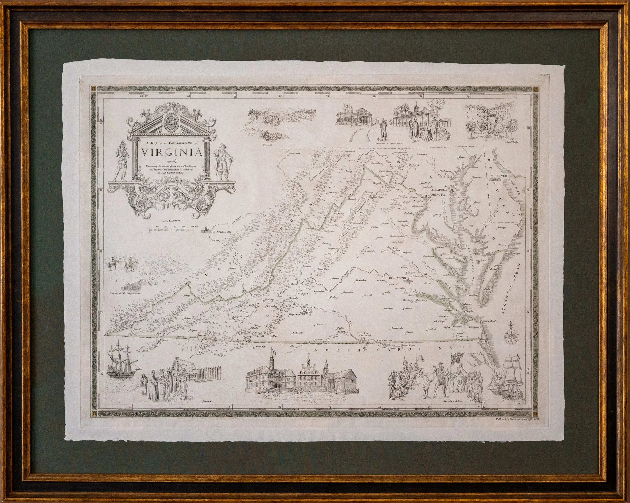 A hand-etched map of Virginia with modern geography and illustrations of important people, places, events, and natural features in Virginia's early history. Illustrations include: Jamestown, Colonial Williamsburg, The Surrender at Yorktown (with the French naval fleet), George Washington's Mount Vernon, Thomas Jefferson's Monticello, Summitting the Blue Ridge Mountains, Great Falls, and Natural Bridge. The map cartouche features great early leaders of Powhatan and Christopher Newport, and the key to the Bastille.